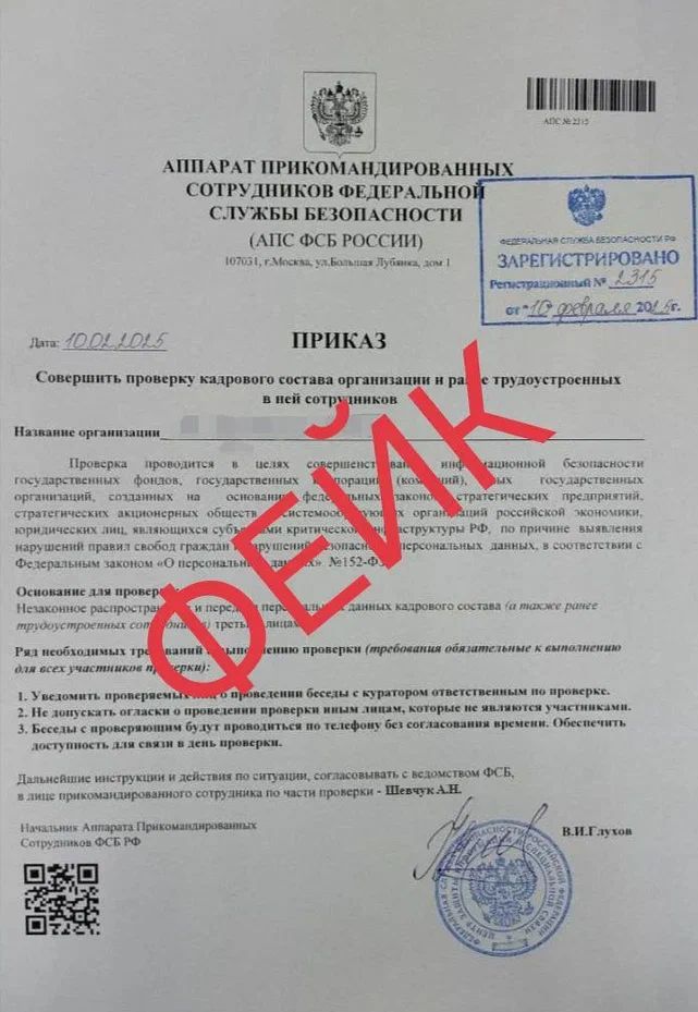 Орловской области. Злоумышленники от лица сотрудников органов безопасности присылают фейковые письма с поддельными уведомлениями о проведении проверок в связи с незаконным распространением и передачей персональных данных работников.
