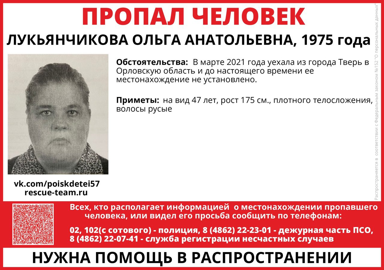 Центр поиска пропавших людей Орловской области попросил орловцев оказать содействие в новом поиске. Разыскивается Ольга Анатольевна Лукьянчикова 1975 года рождения. В марте 2021 года женщина уехала из города Тверь в Орловскую область и исчезла из поля зрения родных и близких. Её поиском занимаются и волонтёры, и полиция.
