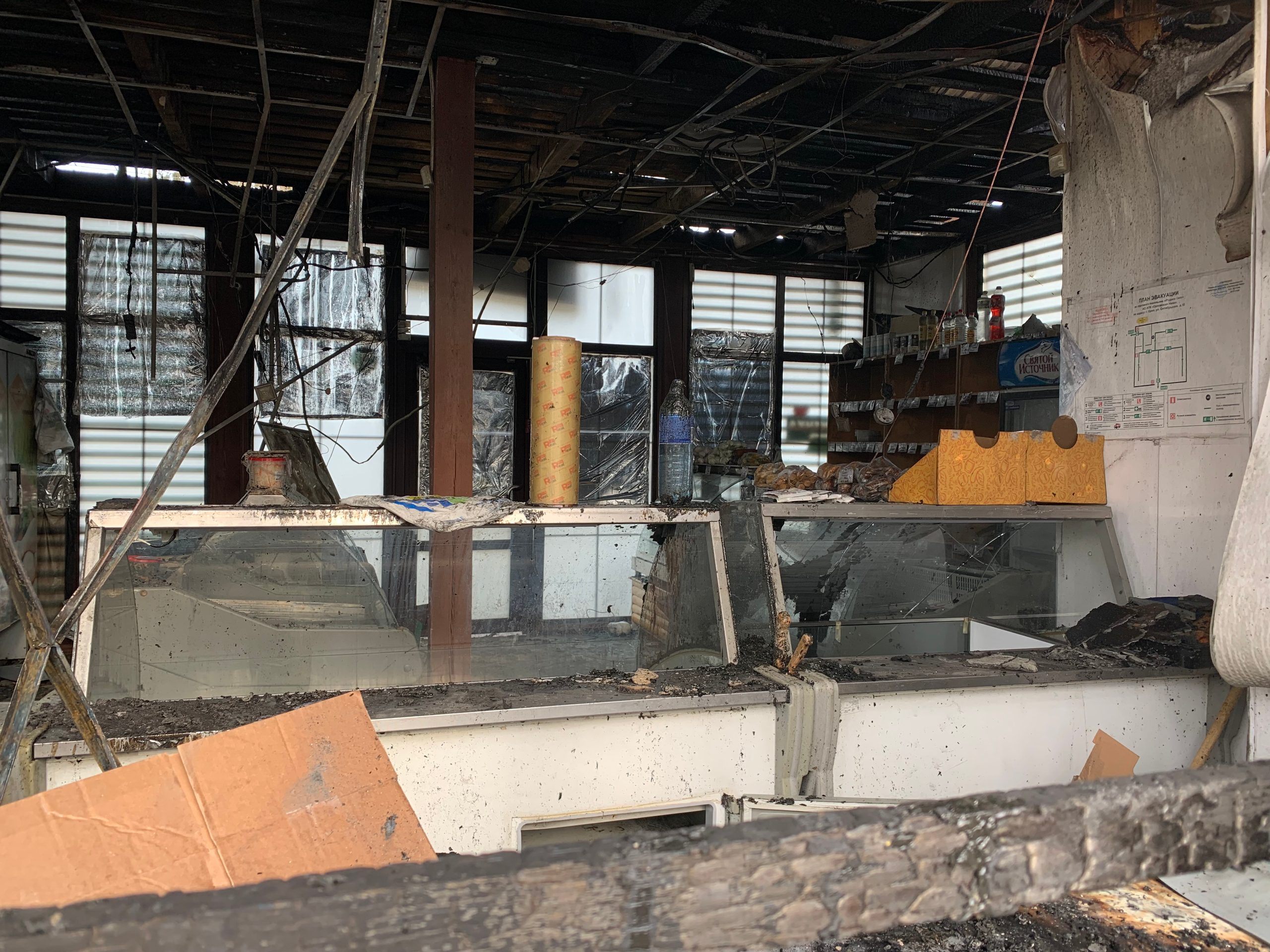 Сегодня утром, 27 марта, корреспондент ОрелТаймс побывал на месте ЧП. Здание почти полностью выгорело. Внутри павильона серьёзные повреждения получили холодильники и другое оборудование магазина. На прилавках ещё лежат продукты – в основном, бакалея и сладости.