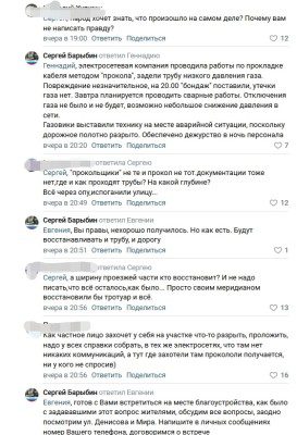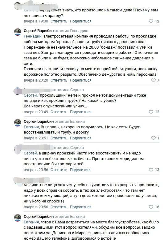 «Электросетевая компания проводила работы по прокладке кабеля методом “прокола”, задели трубу низкого давления газа. Повреждение незначительное, на 20:00 поставили бондаж, утечки газа нет. Сегодня планируется проводить сварочные работы. Отключения газа не было и не будет, возможно небольшое снижение давления в сети. Газовики выставили технику на месте аварийной ситуации, поскольку дорожное полотно разрыто. Обеспечено дежурство персонала», — сообщил чиновник.