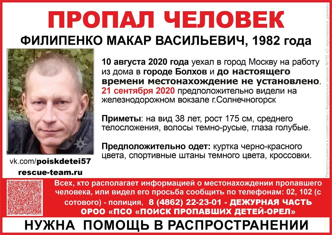 В Орле разыскивают Макара Васильевича Филипенко — жителя Болхова, 1982 года рождения. 10 августа 2020 года он уехал в Москву на работу и перестал выходить на связь. До настоящего времени его местонахождение неизвестно. 21 сентября 2020 предположительно видели на железнодорожном вокзале города Солнечногорск.