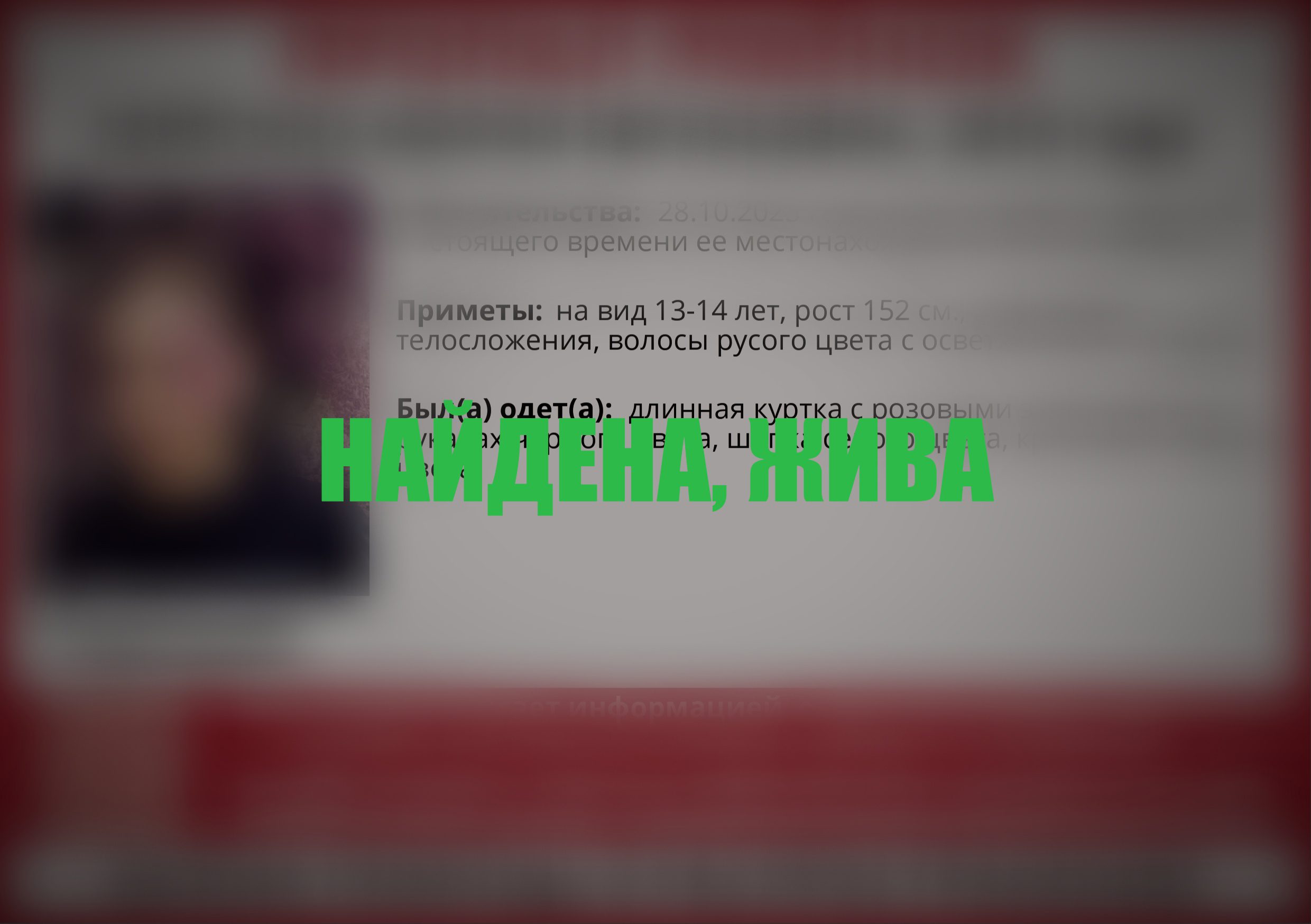 Вчера, 29 октября «Сармат» сообщил, что поиски завершились благополучно: «Найдена, жива».
