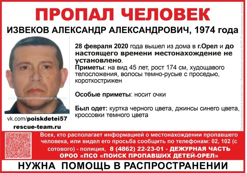 Всех, располагающих информацией о местонахождении Извекова Александра Александровича или видевшего его, просьба сообщить по телефонам: 02, 102 (с сотового) — полиция, 8 (4862) 22-23-01 — Дежурная часть ОРОО «ПСО Поиск пропавших детей-Орел».