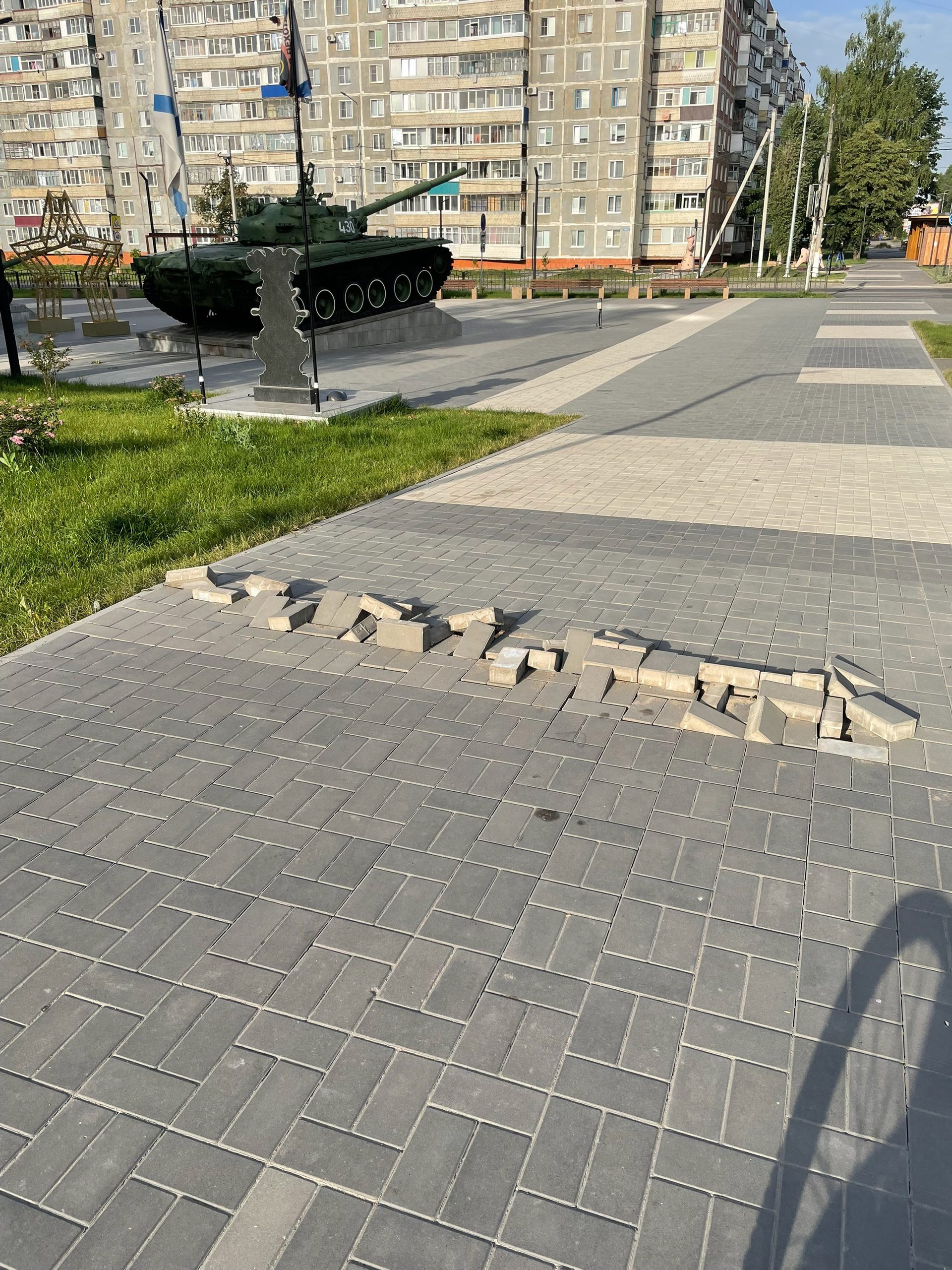 Неизвестные частично разобрали тротуарную плитку на подходе к танку Т-80Б и бросили её там же.