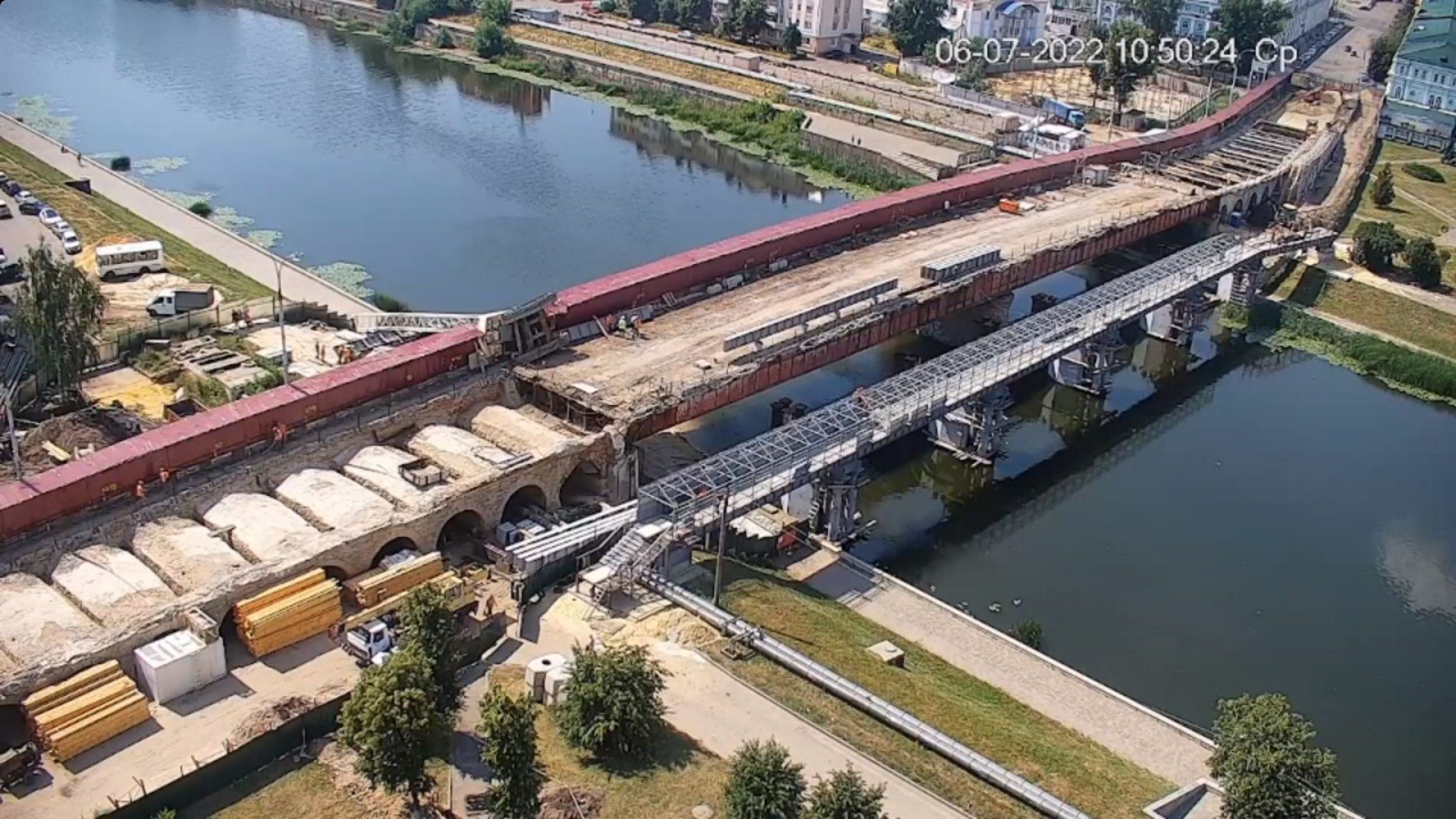 На трансляции с процессом строительства также можно заметить, как кран лежит на мосту. По записи видно, что упал кран примерно в 10:15, когда поднимали одну из строительных балок.