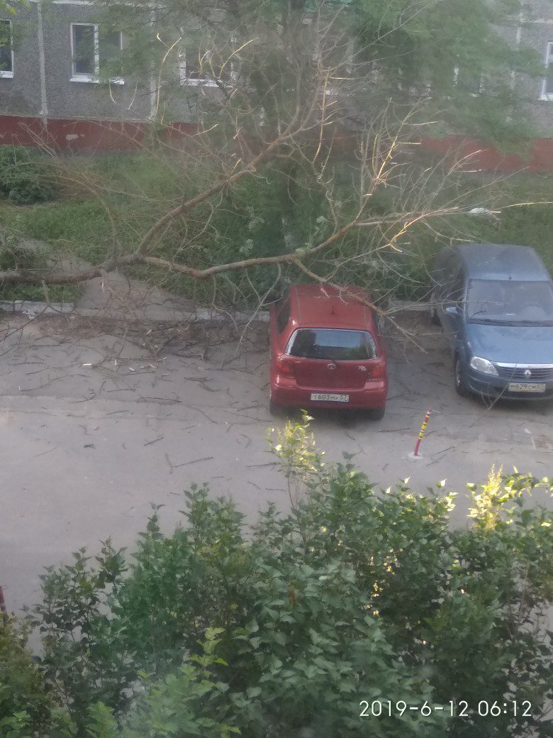 Орловцы в соцсетях делятся фотографиями двора дома № 45 на Планерной улице, где сухое дерево упало на припаркованный автомобиль.
