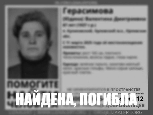 Пенсионерку искали с 11 марта. В новостные заголовки местных СМИ попало описание яркого наряда, в который была одета орловчанка в день исчезновения. Красные гольфы, зелёное пальто, серые калоши и красный платок. Также уточнялось, что женщина имела средний рост: 165 см, плотное телосложение и карие глаза. Поисковики обзванивали больницы и отделения полиции, искали её у знакомых. При каких именно обстоятельствах погибла Валентина Герасимова, не уточняется.