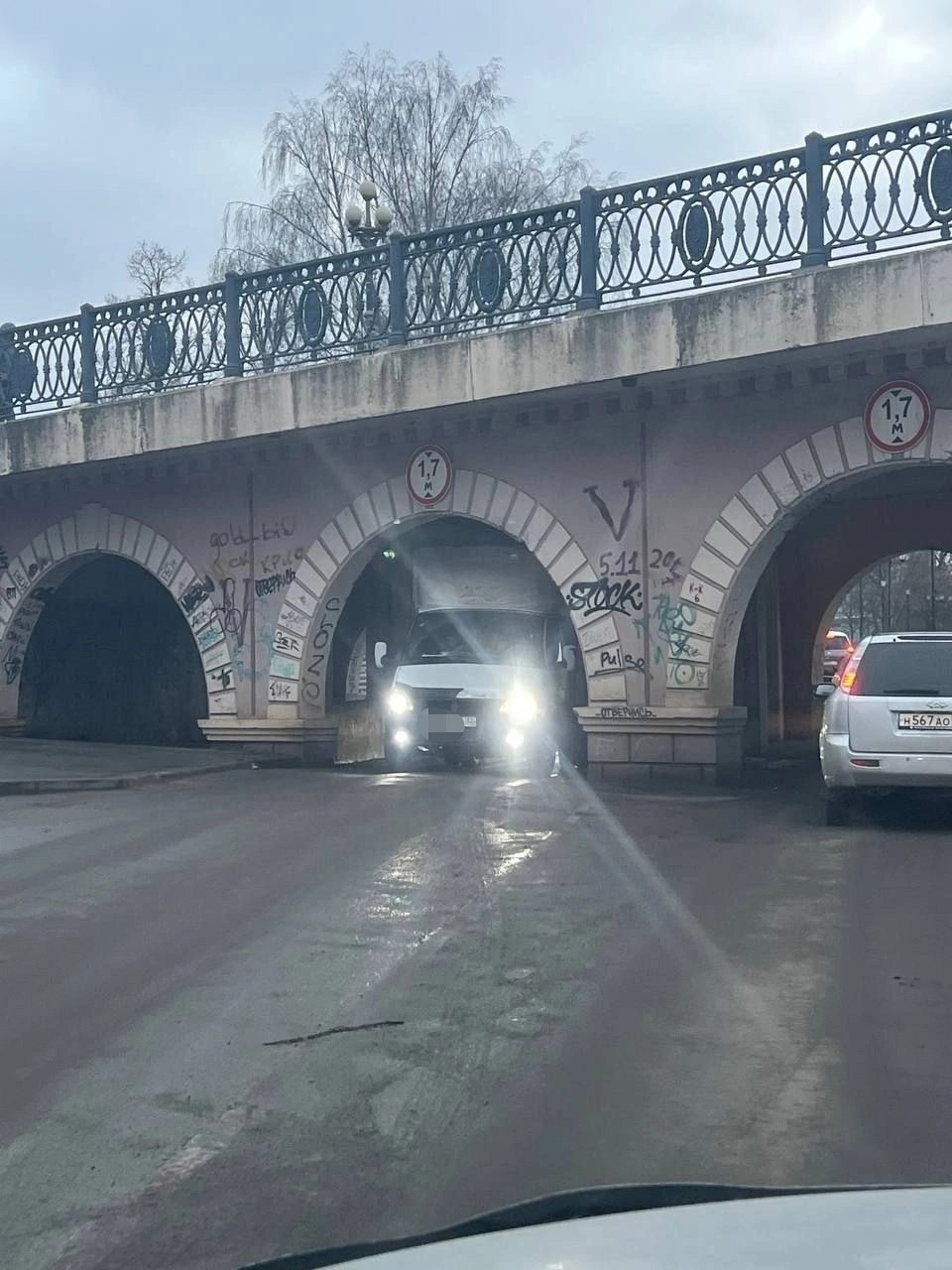 На этот раз установленные здесь знаки, обозначающие высоту пролётов, проигнорировал водитель авто из Брянской области. По крайней мере, об этом можно судить по его госномерам.