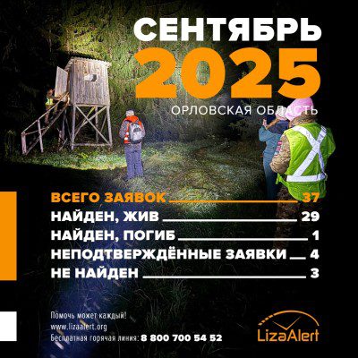 В сентябре в отряд «ЛизаАлерт» Орловской области поступило 37 заявок на поиск.