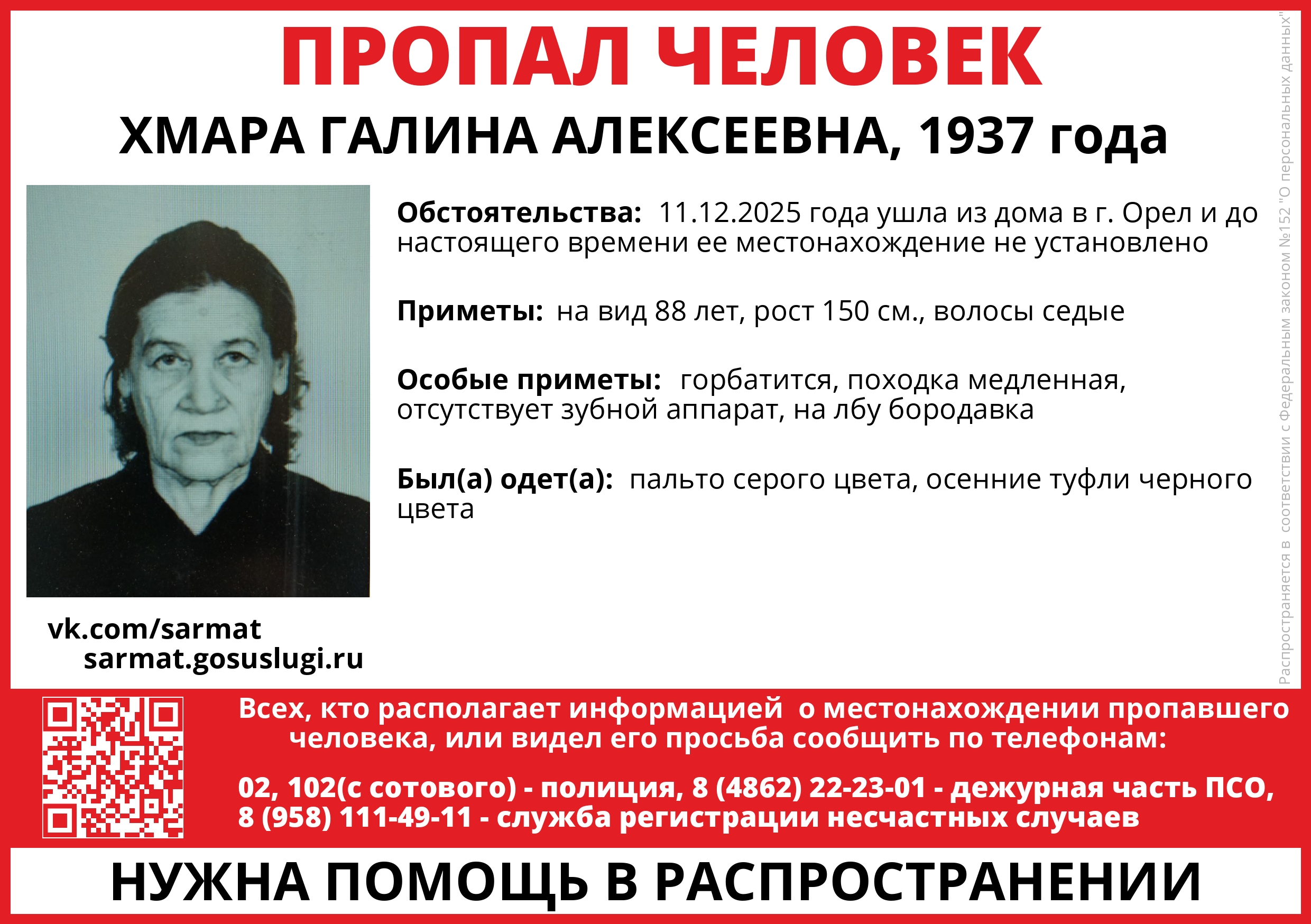 Женщина имеет довольно приметную внешность: рост 150 см, при ходьбе сильно горбится, отсутствуют зубы, на лбу бородавка. В момент исчезновения была одета в серое пальто и осенние туфли чёрного цвета.