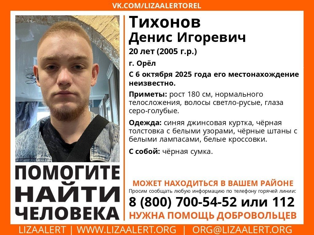 Активисты поискового движения «ЛизаАлерт» Орловской области сообщили о новой пропаже. Близкие потеряли 20-летнего Дениса Тихонова.