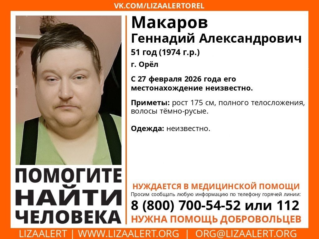 Три дня назад 51-летний житель Орла Геннадий Макаров пропал без вести. К поиску подключились члены поискового движения «ЛизаАлерт». Волонтёры уточнили, мужчина ушёл из дома 27 февраля и пропал. С тех пор не выходит на связь и где находится, неизвестно.