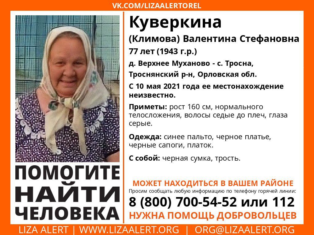 9Орловские поисковики объявили о новом поиске человека. На этот раз пропала 77-летняя Валентина Стефановна Куверкина из села Вернее Муханово, Троснянского района, Орловской области.