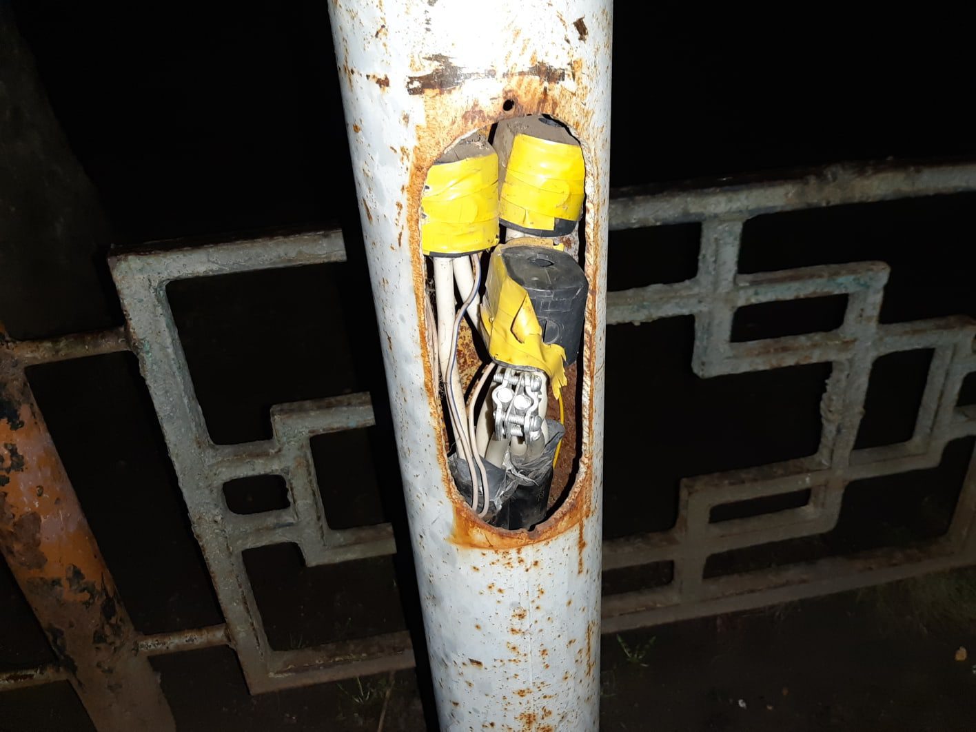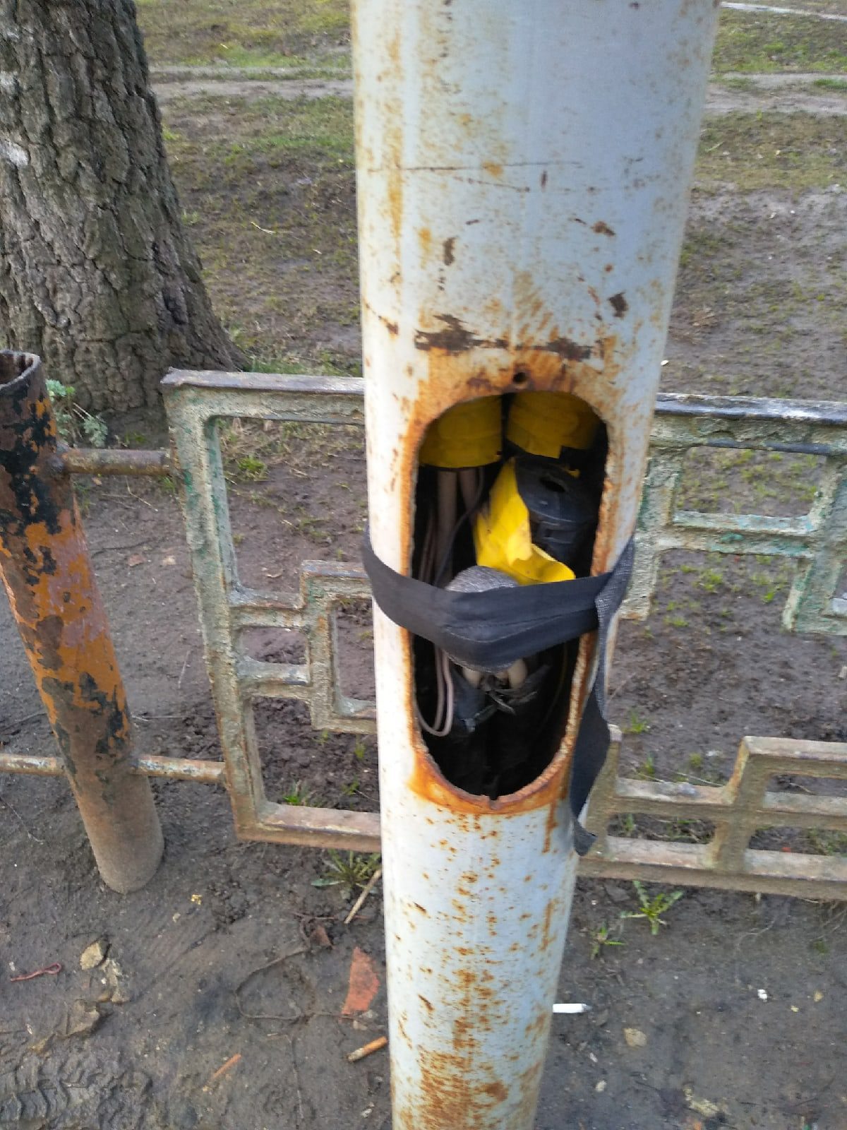 Вот как сейчас выглядит столб на Металлургов. После ЧП его… просто «укрепили» изолентой.