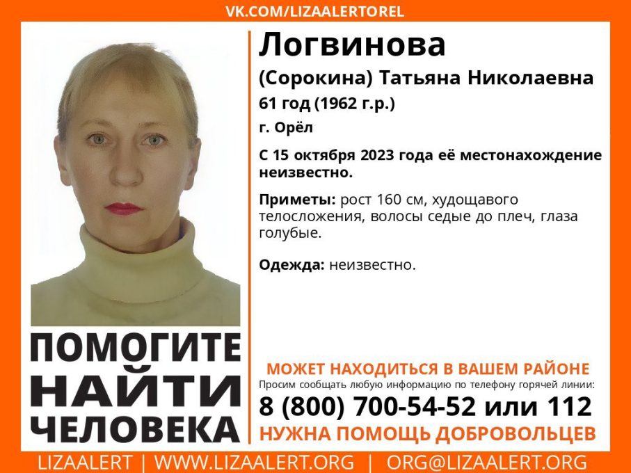 В городе Орле уже месяц ведутся поиски пропавшей женщины. Татьяна Логвинова (Сорокина) покинула свой дом ещё 15 октября, с тех пор о её местонахождении ничего не известно.