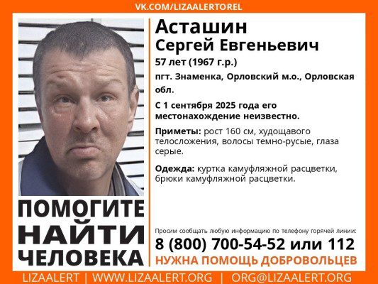 Целый месяц прошёл с того момента, как Сергей Евгеньевич Асташин перестал выходить на связь со своими родственниками. По суровой классике жанра 57-летний житель посёлка Знаменка Орловского МО ушёл из дома и не вернулся. 30 дней неведения, тревоги, волнения.