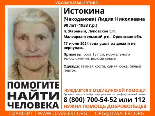 В Малоархангельском районе Орловской области начаты поиски 90-летней Лидии Истокиной (Чекодановой).