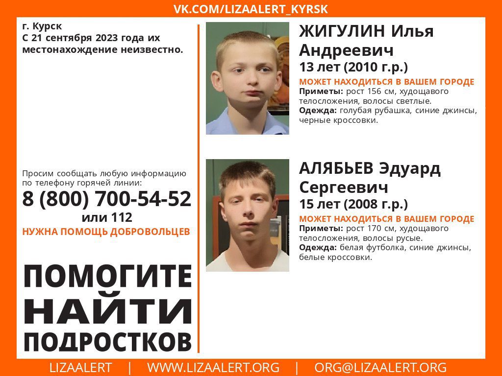О пропавших Илье Жигулине и Эдуарде Алябьеве сообщил поисковый отряд «ЛизаАлерт» Орловской области. 2 сентября они пропали в городе Курсе и с тех пор об их местонахождении ничего не известно.