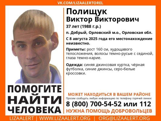 В Орловской области вновь пропал человек. Ориентировку на него опубликовал поисково-спасательный отряд «ЛизаАлерт». Пропал 37-летний Виктор Викторович Полищук.