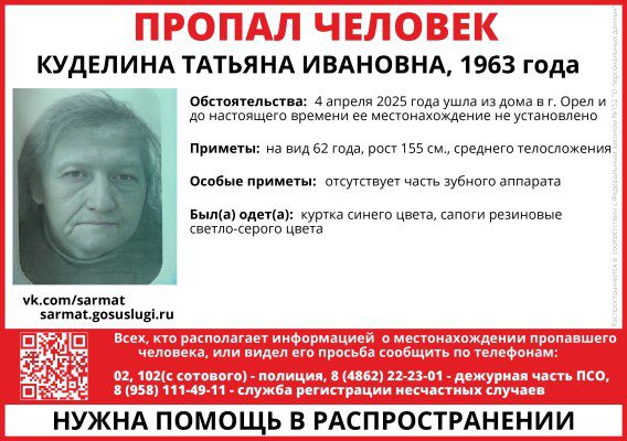 Поисково-спасательный отряд «Сармат» опубликовал ориентировку на жительницу Орловской области – 62-летнюю Татьяну Ивановну Кудинову. Её местонахождение устанавливается службой регистрации несчастных случаев Орловской области.