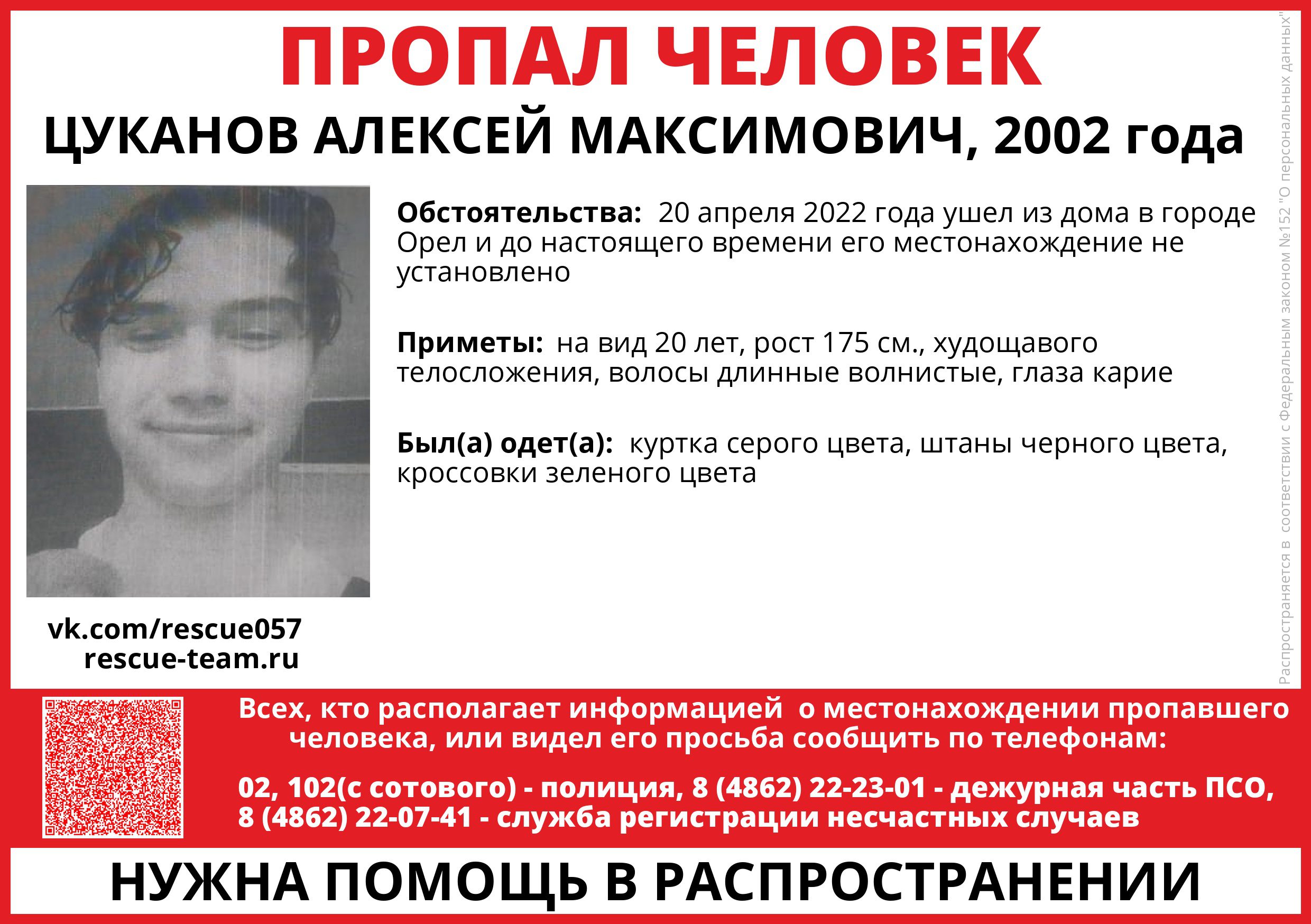 Центр поиска пропавших людей Орловской области разместил ориентировку с его фотографией. На вид молодому человеку 20 лет, рост 175 сантиметров, глаза карие, волосы длинные и волнистые. В момент исчезновения Алексей был одет в серую куртку с капюшоном, чёрные штаны и зелёные кроссовки.