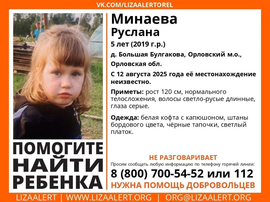 В Орловской области случилось пропал ребёнок. Случилось это в Орловском муниципальном округе. Пропала пятилетняя Руслана Минаева.
