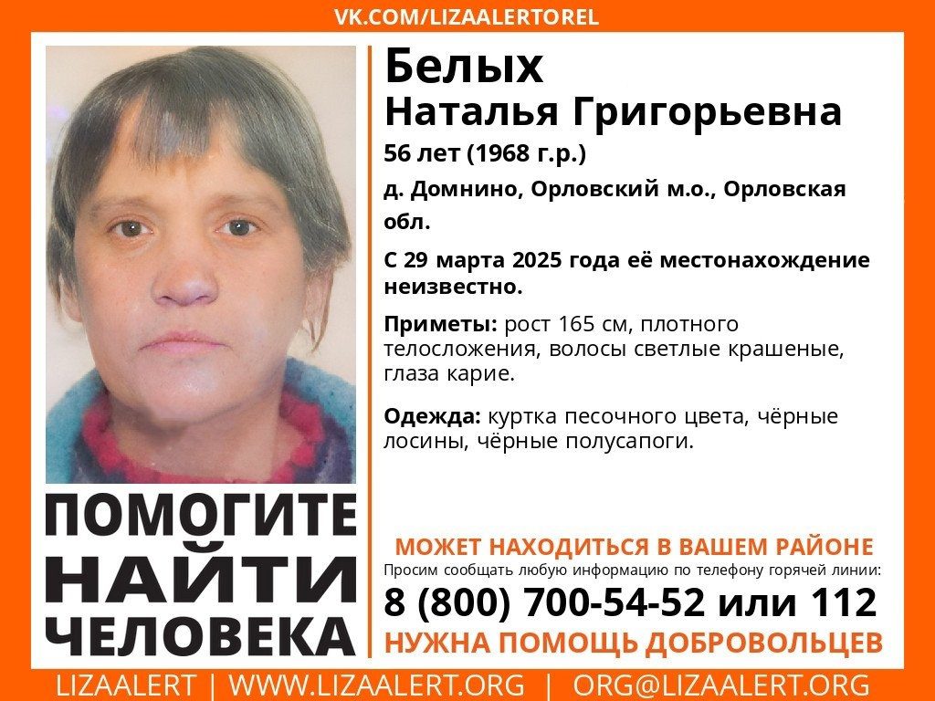 В Орловской области разыскивают Наталью Белых. Ориентировку опубликовал поисково-спасательный отряд «ЛизаАлерт».