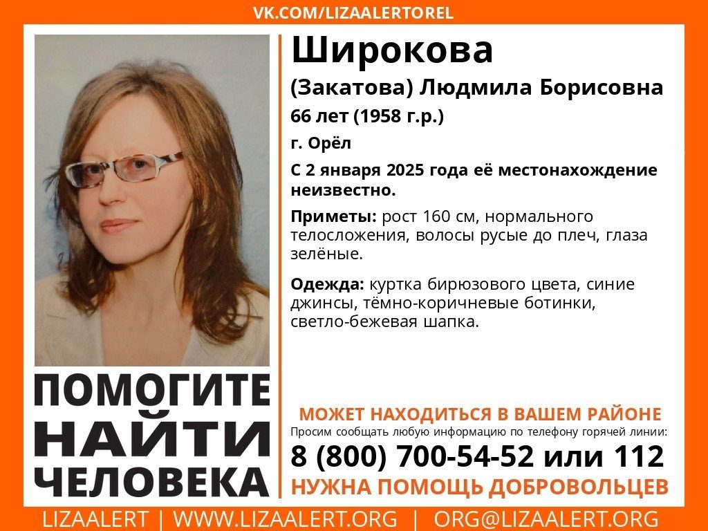 Орловские поисковики отряда «Лиза Алерт» разместили ориентировку на пропавшую орловчанку. Речь идёт о 66-летней Людмиле Борисовне Широковой (Закатовой). Её родственники и знакомые не знают о её местонахождении со 2 января.