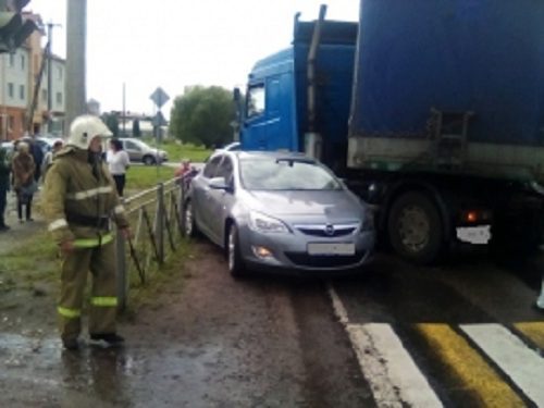 Столкнулись грузовик и легковушка «Opel Astra», в результате ДТП никто не пострадал. Обстоятельства аварии выясняются, но, как видно по фото, похоже, фура выехала на полосу встречного движения и протаранила легковушку.