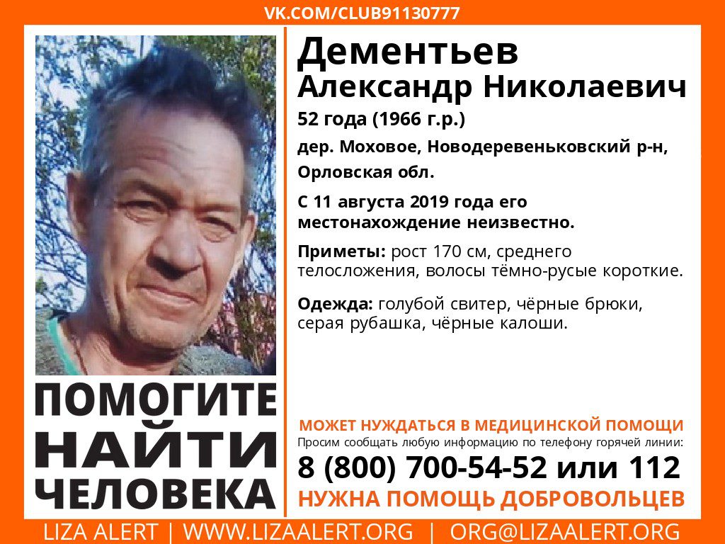 Александр Николаевич Дементьев родом из деревни Моховое, Новодеревеньковского района 11 августа ушёл из дома и не вернулся. 52-летнего мужчину ищут родственники.