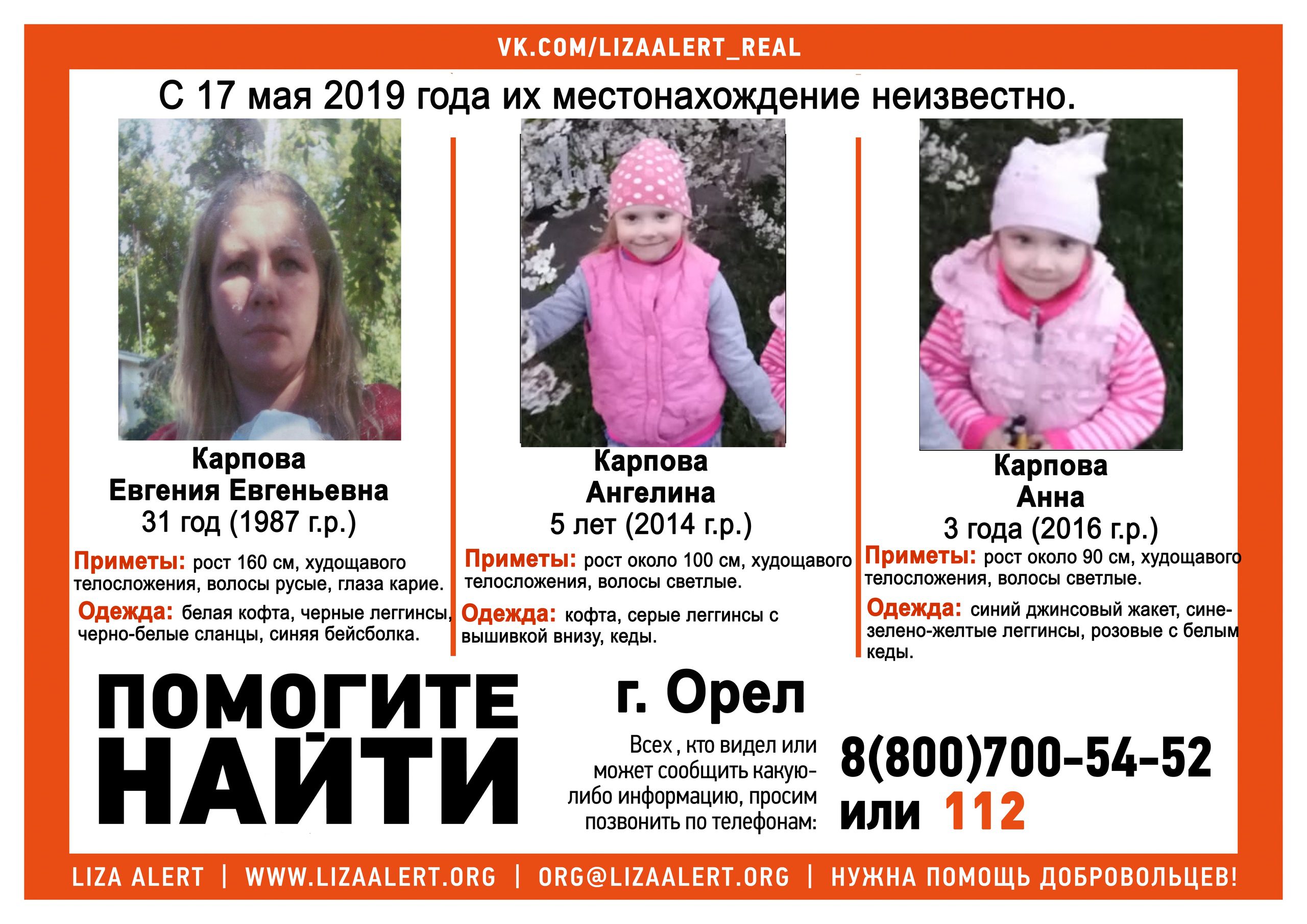 Поисковый отряд «Лиза Алерт» в своей группе в социальной сети объявил новый розыск. Пропали Карпова Евгения Евгеньевна (31 год), Карпова Ангелина (5 лет) и Карпова Анна (3 года). С 17 мая 2019 года их местонахождение неизвестно.