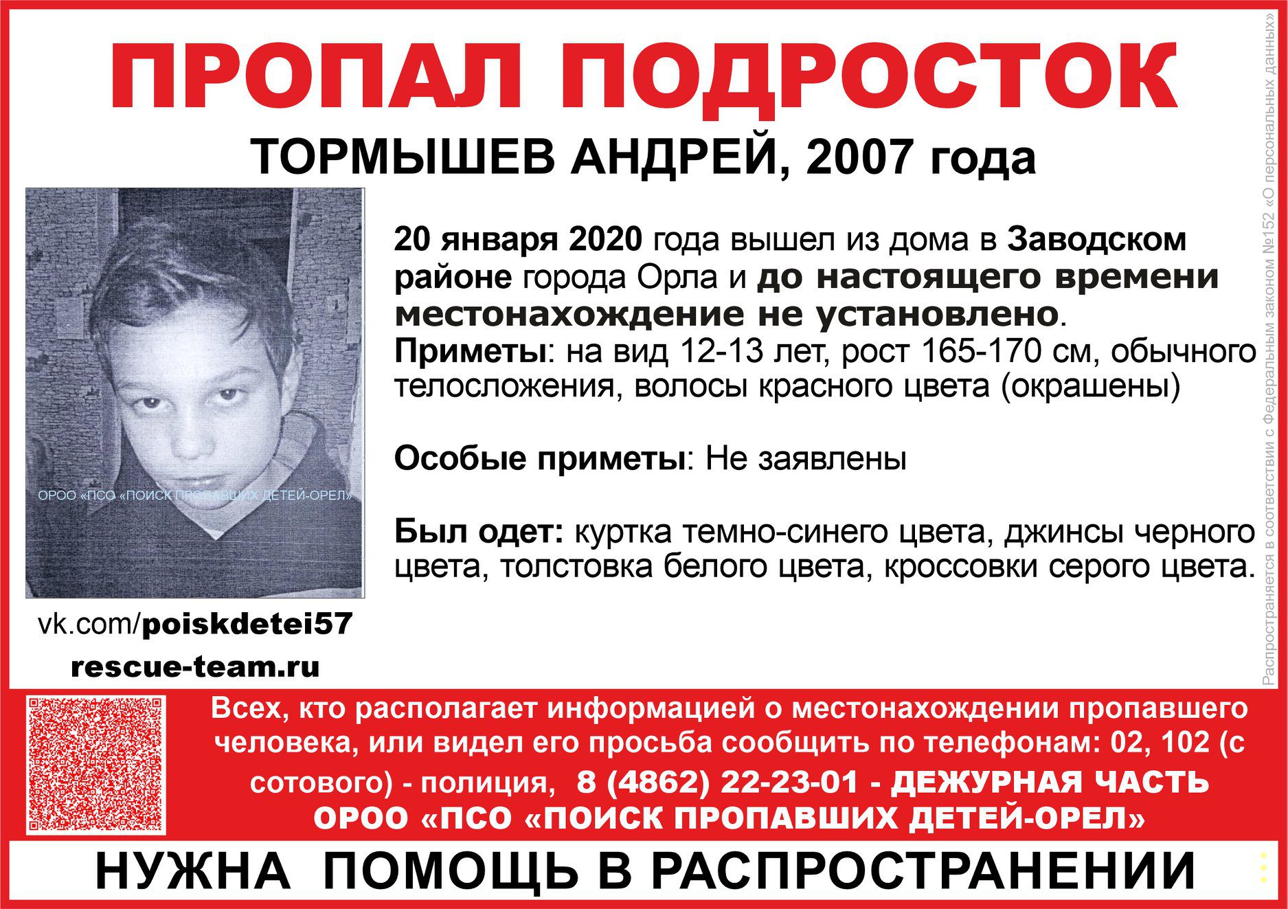В орловских соцсетях бьют тревогу – четыредня назад пропал 13-летний Андрей Тормышев. Мальчик вышел из дома в Заводском районе Орла и до настоящего времени его местонахождение не установлено.