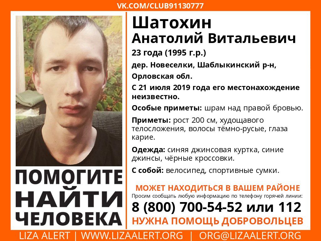 У поискового отряда «Лиза Алерт» очередное непростое задание. 21 июля 2019 года в деревне Новосёлки пропал человек. Близкие и друзья разыскивают Анатолия Витальевич Шатохина 23-х лет. Для поиска нужна помощь добровольцев. Если вам что-то известно об этом человеке, звоните: 8(800) 700-54-52 или 112.