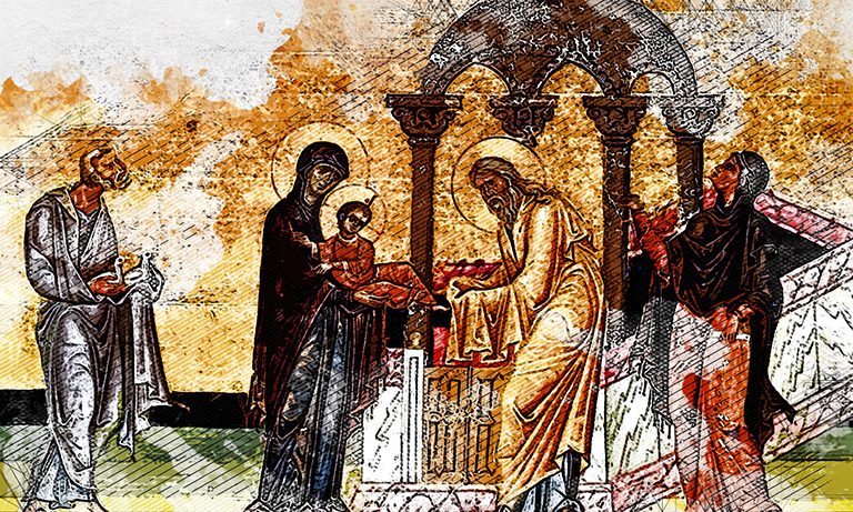 Следуя этому закону, Пресвятая Богородица принесла младенца Иисуса в иерусалимский храм. Их там встретил старец по имени Симеон, которому было предсказано, что он не умрёт, пока не увидит Спасителя.