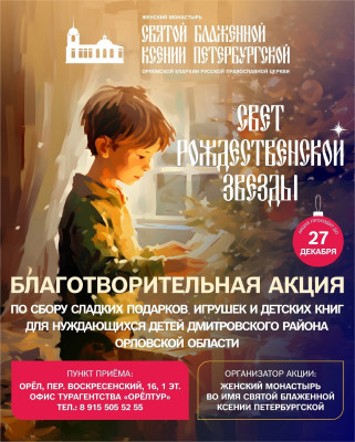 Передать подарки можно до 27 декабря. Пункт сбора: Орёл, пер. Воскресенский, д. 16. Важно: перед визитом позвонить по телефону +79155055255 (куратор акции Евгений Гуров).