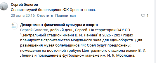 «На территории ОАУ ОО «Центральный стадион имени В. И. Ленина» в 2026 – 2027 годах планируется строительство модульного зала для единоборств. Для размещения музея болельщиков ФК Орёл будут предложены: помещение на восточной трибуне Центрального стадиона имени В. И. Ленина и помещение в футбольном манеже им. И.Я. Мосякина», – сообщали в департаменте.