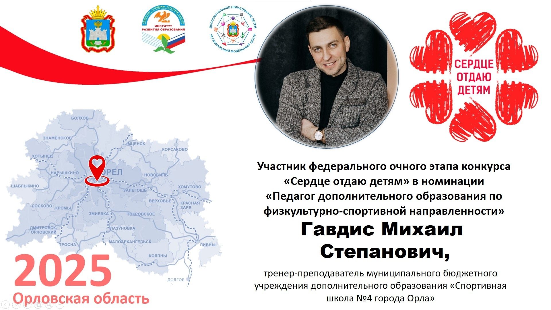 2025 год стал триумфальным для орловца Михаила Гавдиса. Яркий, улыбчивый, харизматичный президент Федерации танцевального спорта Орловской области, тренер-преподаватель спортивной школы №4 города Орла стал одним из победителей престижного Всероссийского конкурса «Сердце отдаю детям».