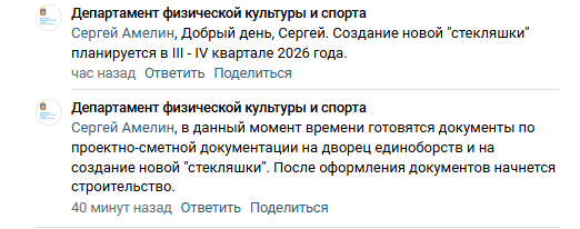 «Создание новой «Стекляшки» планируется в III-IV квартале 2026 года. В данный момент времени готовятся документы по проектно-сметной документации на дворец единоборств и на создание новой «Стекляшки». После оформления документов начнется строительство», — указывается в ответе с аккаунта профильного ведомства.