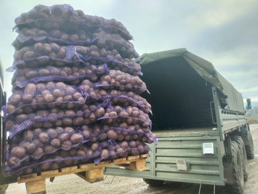 Для бойцов было подготовлено 7 тонн отборного картофеля. Продукцию расфасовали в сетки, уложили на поддоны и специально утеплили грузовой отсек автомобиля, чтобы овощи не замёрзли при зимней перевозке.