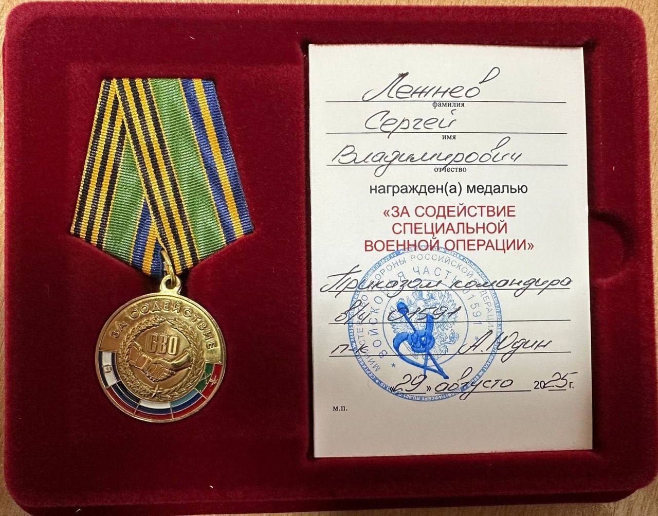 Советник губернатора Орловской области Сергей Лежнев опубликовал удостоверение о получении медали «За содействие специальной военной операции».