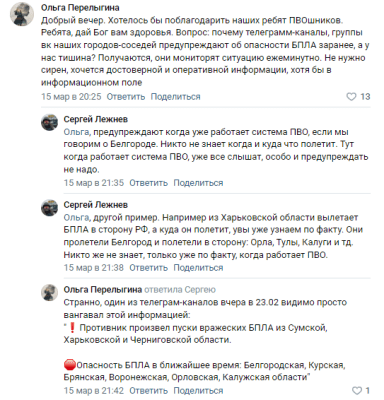«Предупреждают, когда уже работает система ПВО, если мы говорим о Белгороде. Никто не знает, когда и куда что полетит. Тут когда работает система ПВО, уже все слышат, особо и предупреждать не надо. Другой пример. Например, из Харьковской области вылетает БПЛА в сторону РФ, а куда он полетит, увы, уже узнаём по факту. Они пролетели Белгород и полетели в сторону Орла, Тулы, Калуги и т.д. Никто же не знает, только уже по факту, когда работает ПВО», — пояснил советник губернатора.