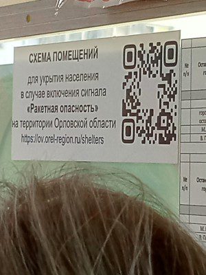 В общественном транспорте Орла появились информационные таблички, на которых указано: схема помещений для укрытия населения в случае ракетная опасность на территории Орловской области. Но самой схемы нет. Есть ссылка на сайт и QR-код. Ни тот, ни другое, естественно, не работает, поскольку в городе нет мобильного интернета.