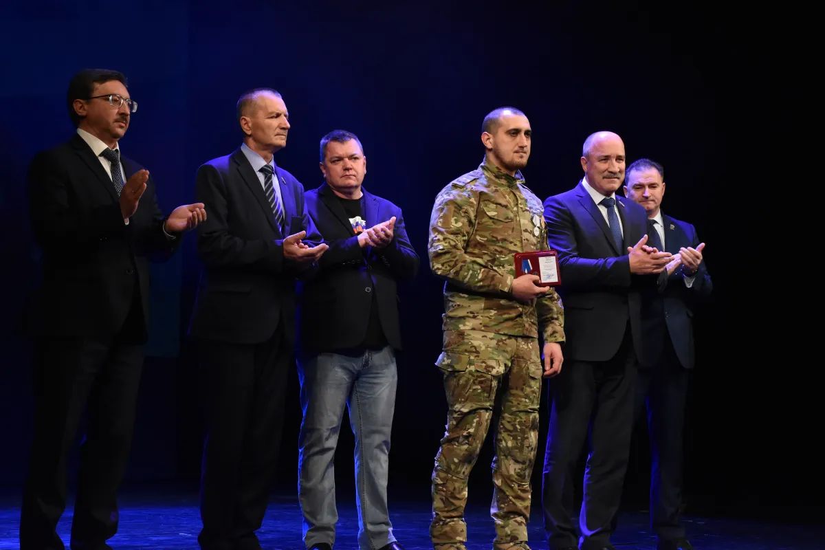В ходе благотворительной акции председатель облсовета Леонид Музалевский вручил памятную медаль регионального парламента «За самоотверженность и патриотизм» уроженцу Орловской области, участнику легендарной операции «Поток» Евгению Варламову.