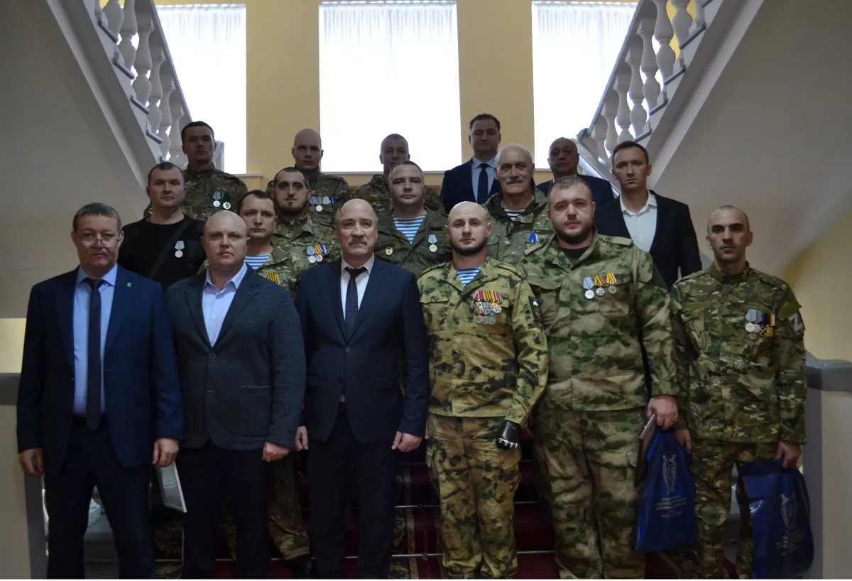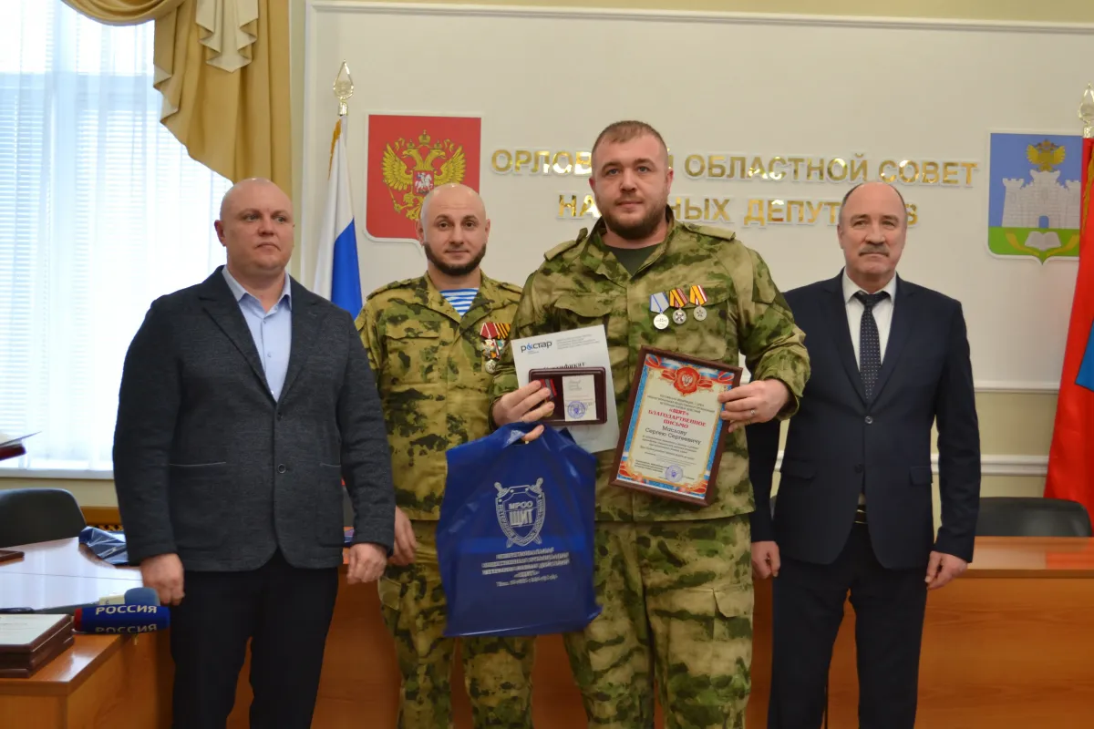 Председатель организации «Щит» Сергей Бабичев обратился к воинам, получившим ветеранские медали: «Спасибо вам, ребята, за стойкость и верность долгу. Вы — живой пример для всех нас. Наша организация гордится возможностью называть вас братьями и быть вашей опорой здесь, дома».