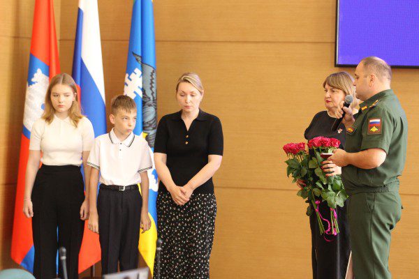 Награду погибшего орловца из рук Военного комиссара Орловского МО Максима Быковского получила его вдова Ольга Казарина.