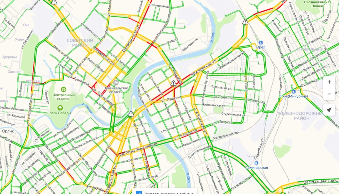 Сейчас карта Яндекса стала жёлтой – это значит, что во многих местах движение затруднено. Окрасились в красный участки на Болховском шоссе, ул. Раздольной, а также возле здания правительства области. В пробках стоит центр на ул. Комсомольской. К слову, некоторые участки Яндекс пометил как опасные.