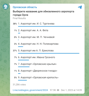 Что касается голосования: оно было завершено 8 декабря 2023 года и проходило на трёх площадках: ВКонтакте, «Одноклассниках» и telegram-канале «Орловская область». В двух из них (а именно ВК и «Одноклассниках») с существенным перевесом победил вариант «Аэропорт им. Н.Н. Поликарпова».