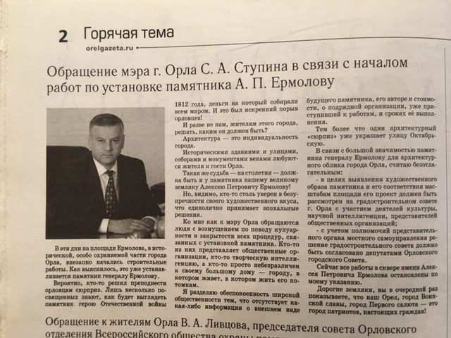 Возмутился и тогдашний мэр Орла Сергей Ступин – нынешний директор Музея-заповедника И.С. Тургенева «Спасское-Лутовиново». Настолько, что обратился к народу через «Орловскую городскую газету»: «В особо охраняемой зоне внезапно начались строительные работы. Как выяснилось, это уже устанавливается памятник генералу Ермолову. Вероятно, кто-то решил преподнести орловцам сюрприз…