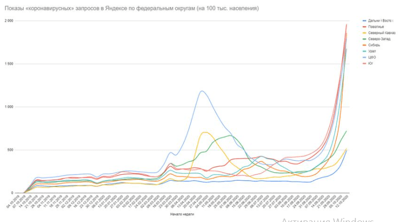 «В двух словах: происходит катастрофа, и она повсеместна. Разобрал ситуацию по России в целом и по всем федеральным округам: что можно сказать на основе 10 «коронавирусных» поисковых запросов», – пишет автор.