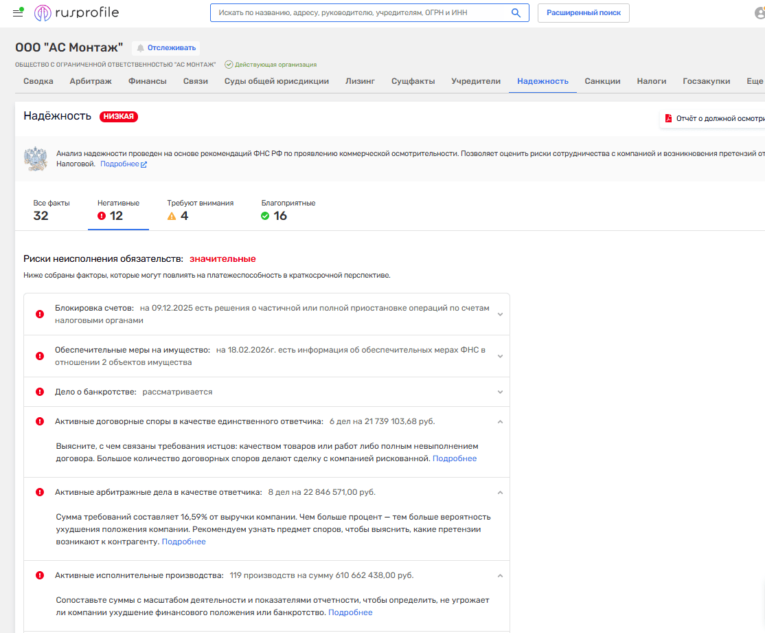 - Активные арбитражные дела в качестве ответчика: 8 дел на 22,8 млн рублей; Активные исполнительные производства: 119 производств на сумму 610,6 млн рублей.